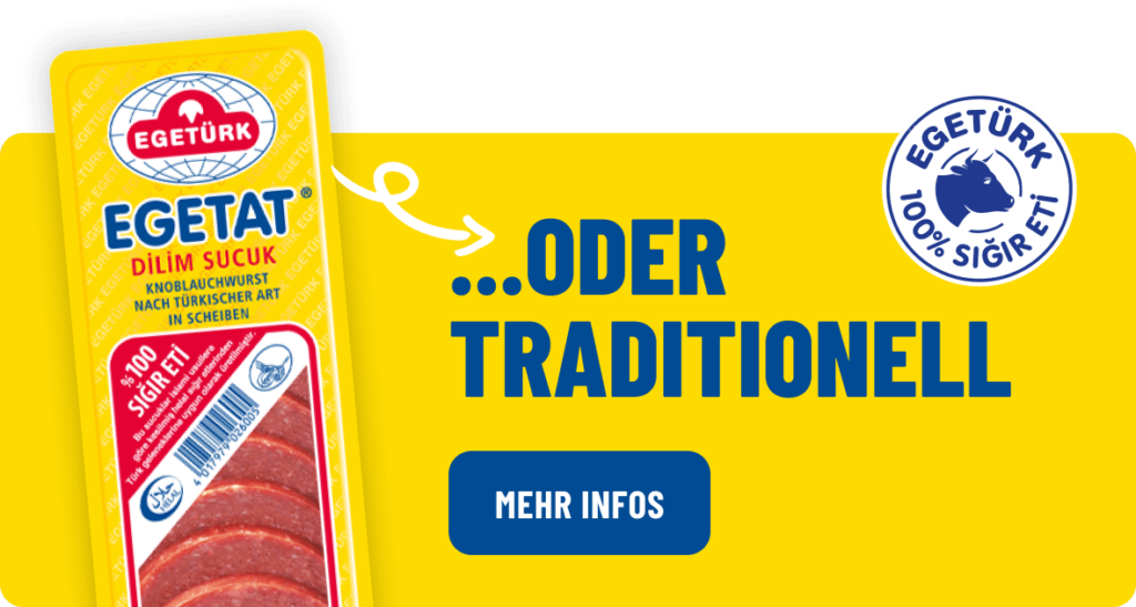 Unsere Klassiker mit Fleisch gibt es seit über 60 Jahren. Mit der vegane Sucuk gibt es nun auch eine 100% vegane Alternative für den köstlichen Egetürk Genuss.
